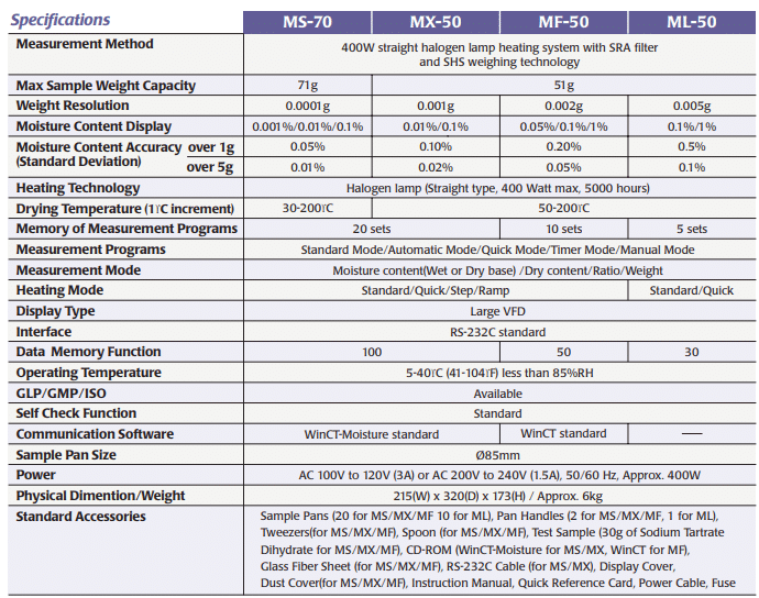 | SPECIFICATIONS | MS-70 | MX-50 | MF-50 | ML-50 |