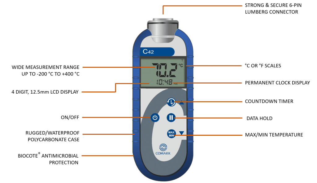 The C42C Food Thermometer has a 4-button design for simple operation and is powered by 2 AA batteries. The C42C Food Thermometer includes MAX and MIN, as well as HOLD, for improved convenience. In addition, Temperature Alarms are now standard across the C4X range.