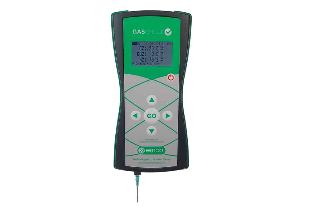 The GasCheck is a handheld, portable gas analyser for measuring O2 + CO2 + N2 in package headspace
