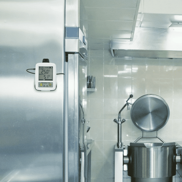 The ThermaData TD1F temperature data logger features two sensors: an internal temperature sensor and an external penetration probe. Secure the device to the outside of a fridge/freezer to monitor the room temperature and place the external probe inside the fridge to log chilled product temperatures.
